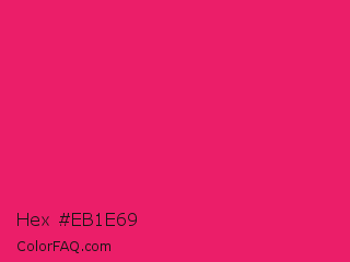 Hex #eb1e69 Color is a normal rose color and the nearest color is Razzmatazz #e3256b. Hex code #eb1e69 and RGB value is rgb(235,30,105). In RGB color space, this color is composed of 92% red, 12% green, 41% blue, In CMYK color space, this color is composed of 0% cyan, 87% magenta, 55% yellow , 8% black , In HSL color space, this color has a hue angle of 338° , 84% saturation and 52% lightness.
