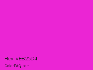 Hex #eb25d4 Color is a normal magenta color and the nearest color is Hot Magenta #ff1dce. Hex code #eb25d4 and RGB value is rgb(235,37,212). In RGB color space, this color is composed of 92% red, 15% green, 83% blue, In CMYK color space, this color is composed of 0% cyan, 84% magenta, 10% yellow , 8% black , In HSL color space, this color has a hue angle of 307° , 83% saturation and 53% lightness.