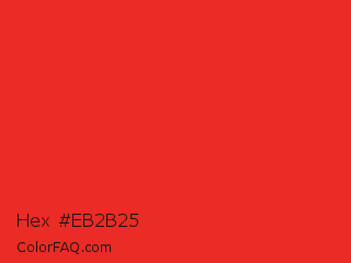 Hex #eb2b25 Color is a normal red color and the nearest color is Permanent Geranium Lake #e12c2c. Hex code #eb2b25 and RGB value is rgb(235,43,37). In RGB color space, this color is composed of 92% red, 17% green, 15% blue, In CMYK color space, this color is composed of 0% cyan, 82% magenta, 84% yellow , 8% black , In HSL color space, this color has a hue angle of 2° , 83% saturation and 53% lightness.