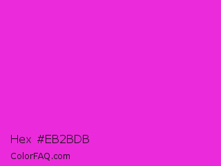 Hex #eb2bdb Color is a normal magenta color and the nearest color is Razzle Dazzle Rose #ff33cc. Hex code #eb2bdb and RGB value is rgb(235,43,219). In RGB color space, this color is composed of 92% red, 17% green, 86% blue, In CMYK color space, this color is composed of 0% cyan, 82% magenta, 7% yellow , 8% black , In HSL color space, this color has a hue angle of 305° , 83% saturation and 55% lightness.