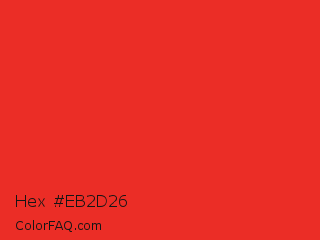 Hex #eb2d26 Color is a normal red color and the nearest color is Permanent Geranium Lake #e12c2c. Hex code #eb2d26 and RGB value is rgb(235,45,38). In RGB color space, this color is composed of 92% red, 18% green, 15% blue, In CMYK color space, this color is composed of 0% cyan, 81% magenta, 84% yellow , 8% black , In HSL color space, this color has a hue angle of 2° , 83% saturation and 54% lightness.