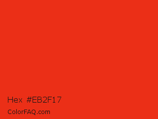 Hex #eb2f17 Color is a normal red color and the nearest color is Lust #e62020. Hex code #eb2f17 and RGB value is rgb(235,47,23). In RGB color space, this color is composed of 92% red, 18% green, 9% blue, In CMYK color space, this color is composed of 0% cyan, 80% magenta, 90% yellow , 8% black , In HSL color space, this color has a hue angle of 7° , 84% saturation and 51% lightness.