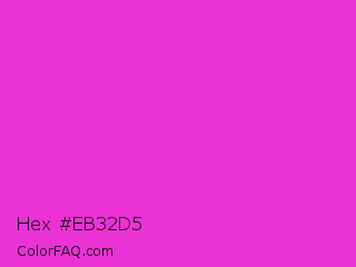 Hex #eb32d5 Color is a normal magenta color and the nearest color is Razzle Dazzle Rose #ff33cc. Hex code #eb32d5 and RGB value is rgb(235,50,213). In RGB color space, this color is composed of 92% red, 20% green, 84% blue, In CMYK color space, this color is composed of 0% cyan, 79% magenta, 9% yellow , 8% black , In HSL color space, this color has a hue angle of 307° , 82% saturation and 56% lightness.