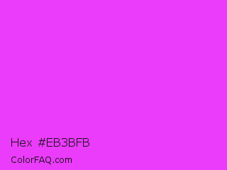Hex #eb3bfb Color is a light magenta color and the nearest color is Purple Pizzazz #fe4eda. Hex code #eb3bfb and RGB value is rgb(235,59,251). In RGB color space, this color is composed of 92% red, 23% green, 98% blue, In CMYK color space, this color is composed of 6% cyan, 76% magenta, 0% yellow , 2% black , In HSL color space, this color has a hue angle of 295° , 96% saturation and 61% lightness.