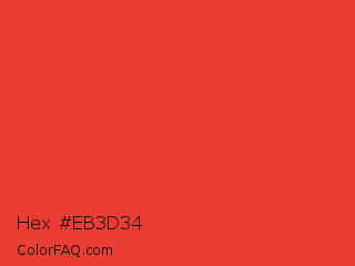 Hex #eb3d34 Color is a normal red color and the nearest color is Cinnabar #e34234. Hex code #eb3d34 and RGB value is rgb(235,61,52). In RGB color space, this color is composed of 92% red, 24% green, 20% blue, In CMYK color space, this color is composed of 0% cyan, 74% magenta, 78% yellow , 8% black , In HSL color space, this color has a hue angle of 3° , 82% saturation and 56% lightness.