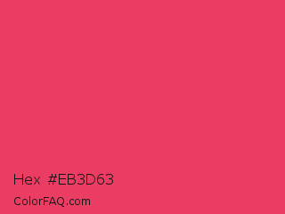 Hex #eb3d63 Color is a normal red color and the nearest color is Paradise Pink #e63e62. Hex code #eb3d63 and RGB value is rgb(235,61,99). In RGB color space, this color is composed of 92% red, 24% green, 39% blue, In CMYK color space, this color is composed of 0% cyan, 74% magenta, 58% yellow , 8% black , In HSL color space, this color has a hue angle of 347° , 81% saturation and 58% lightness.