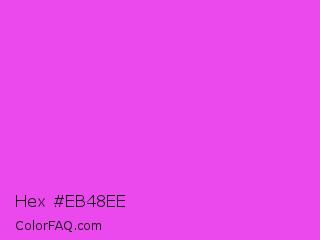Hex #eb48ee Color is a light magenta color and the nearest color is Purple Pizzazz #fe4eda. Hex code #eb48ee and RGB value is rgb(235,72,238). In RGB color space, this color is composed of 92% red, 28% green, 93% blue, In CMYK color space, this color is composed of 1% cyan, 70% magenta, 0% yellow , 7% black , In HSL color space, this color has a hue angle of 299° , 83% saturation and 61% lightness.