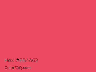 Hex #eb4a62 Color is a light red color and the nearest color is Paradise Pink #e63e62. Hex code #eb4a62 and RGB value is rgb(235,74,98). In RGB color space, this color is composed of 92% red, 29% green, 38% blue, In CMYK color space, this color is composed of 0% cyan, 69% magenta, 58% yellow , 8% black , In HSL color space, this color has a hue angle of 351° , 80% saturation and 61% lightness.