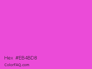 Hex #eb4bd8 Color is a light magenta color and the nearest color is Purple Pizzazz #fe4eda. Hex code #eb4bd8 and RGB value is rgb(235,75,216). In RGB color space, this color is composed of 92% red, 29% green, 85% blue, In CMYK color space, this color is composed of 0% cyan, 68% magenta, 8% yellow , 8% black , In HSL color space, this color has a hue angle of 307° , 80% saturation and 61% lightness.