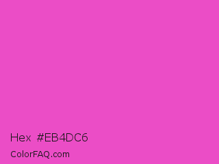 Hex #eb4dc6 Color is a light magenta color and the nearest color is Light Deep Pink #ff5ccd. Hex code #eb4dc6 and RGB value is rgb(235,77,198). In RGB color space, this color is composed of 92% red, 30% green, 78% blue, In CMYK color space, this color is composed of 0% cyan, 67% magenta, 16% yellow , 8% black , In HSL color space, this color has a hue angle of 314° , 80% saturation and 61% lightness.