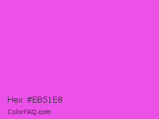 Hex #eb51e8 Color is a light magenta color and the nearest color is Purple Pizzazz #fe4eda. Hex code #eb51e8 and RGB value is rgb(235,81,232). In RGB color space, this color is composed of 92% red, 32% green, 91% blue, In CMYK color space, this color is composed of 0% cyan, 66% magenta, 1% yellow , 8% black , In HSL color space, this color has a hue angle of 301° , 79% saturation and 62% lightness.