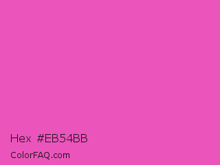 Hex #eb54bb Color is a light magenta color and the nearest color is Brilliant Rose #f653a6. Hex code #eb54bb and RGB value is rgb(235,84,187). In RGB color space, this color is composed of 92% red, 33% green, 73% blue, In CMYK color space, this color is composed of 0% cyan, 64% magenta, 20% yellow , 8% black , In HSL color space, this color has a hue angle of 319° , 79% saturation and 63% lightness.