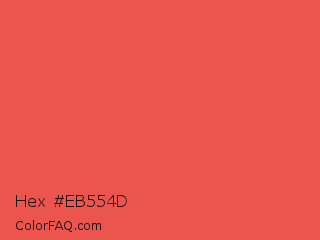 Hex #eb554d Color is a light red color and the nearest color is Carmine Pink #eb4c42. Hex code #eb554d and RGB value is rgb(235,85,77). In RGB color space, this color is composed of 92% red, 33% green, 30% blue, In CMYK color space, this color is composed of 0% cyan, 64% magenta, 67% yellow , 8% black , In HSL color space, this color has a hue angle of 3° , 80% saturation and 61% lightness.