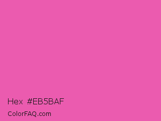 Hex #eb5baf Color is a light magenta color and the nearest color is Brilliant Rose #f653a6. Hex code #eb5baf and RGB value is rgb(235,91,175). In RGB color space, this color is composed of 92% red, 36% green, 69% blue, In CMYK color space, this color is composed of 0% cyan, 61% magenta, 26% yellow , 8% black , In HSL color space, this color has a hue angle of 325° , 78% saturation and 64% lightness.