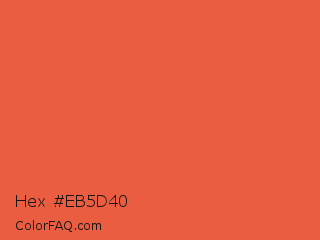 Hex #eb5d40 Color is a normal red color and the nearest color is Orange Soda #fa5b3d. Hex code #eb5d40 and RGB value is rgb(235,93,64). In RGB color space, this color is composed of 92% red, 36% green, 25% blue, In CMYK color space, this color is composed of 0% cyan, 60% magenta, 73% yellow , 8% black , In HSL color space, this color has a hue angle of 10° , 81% saturation and 59% lightness.