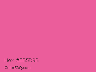 Hex #eb5d9b Color is a light rose color and the nearest color is Raspberry Pink #e25098. Hex code #eb5d9b and RGB value is rgb(235,93,155). In RGB color space, this color is composed of 92% red, 36% green, 61% blue, In CMYK color space, this color is composed of 0% cyan, 60% magenta, 34% yellow , 8% black , In HSL color space, this color has a hue angle of 334° , 78% saturation and 64% lightness.