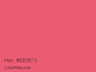 Hex #eb5e71 Color is a light red color and the nearest color is Light Carmine Pink #e66771. Hex code #eb5e71 and RGB value is rgb(235,94,113). In RGB color space, this color is composed of 92% red, 37% green, 44% blue, In CMYK color space, this color is composed of 0% cyan, 60% magenta, 52% yellow , 8% black , In HSL color space, this color has a hue angle of 352° , 78% saturation and 65% lightness.