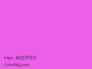 Hex #eb5fe9 Color is a light magenta color and the nearest color is Purple Pizzazz #fe4eda. Hex code #eb5fe9 and RGB value is rgb(235,95,233). In RGB color space, this color is composed of 92% red, 37% green, 91% blue, In CMYK color space, this color is composed of 0% cyan, 60% magenta, 1% yellow , 8% black , In HSL color space, this color has a hue angle of 301° , 78% saturation and 65% lightness.