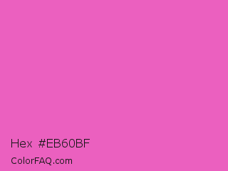 Hex #eb60bf Color is a light magenta color and the nearest color is Hot Pink #ff69b4. Hex code #eb60bf and RGB value is rgb(235,96,191). In RGB color space, this color is composed of 92% red, 38% green, 75% blue, In CMYK color space, this color is composed of 0% cyan, 59% magenta, 19% yellow , 8% black , In HSL color space, this color has a hue angle of 319° , 78% saturation and 65% lightness.