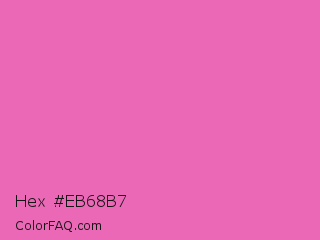 Hex #eb68b7 Color is a light magenta color and the nearest color is Hot Pink #ff69b4. Hex code #eb68b7 and RGB value is rgb(235,104,183). In RGB color space, this color is composed of 92% red, 41% green, 72% blue, In CMYK color space, this color is composed of 0% cyan, 56% magenta, 22% yellow , 8% black , In HSL color space, this color has a hue angle of 324° , 77% saturation and 66% lightness.