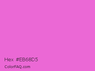Hex #eb68d5 Color is a light magenta color and the nearest color is Orchid #da70d6. Hex code #eb68d5 and RGB value is rgb(235,104,213). In RGB color space, this color is composed of 92% red, 41% green, 84% blue, In CMYK color space, this color is composed of 0% cyan, 56% magenta, 9% yellow , 8% black , In HSL color space, this color has a hue angle of 310° , 77% saturation and 66% lightness.