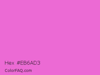Hex #eb6ad3 Color is a light magenta color and the nearest color is Orchid #da70d6. Hex code #eb6ad3 and RGB value is rgb(235,106,211). In RGB color space, this color is composed of 92% red, 42% green, 83% blue, In CMYK color space, this color is composed of 0% cyan, 55% magenta, 10% yellow , 8% black , In HSL color space, this color has a hue angle of 311° , 76% saturation and 67% lightness.