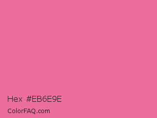 Hex #eb6e9e Color is a light rose color and the nearest color is Cyclamen #f56fa1. Hex code #eb6e9e and RGB value is rgb(235,110,158). In RGB color space, this color is composed of 92% red, 43% green, 62% blue, In CMYK color space, this color is composed of 0% cyan, 53% magenta, 33% yellow , 8% black , In HSL color space, this color has a hue angle of 337° , 76% saturation and 68% lightness.