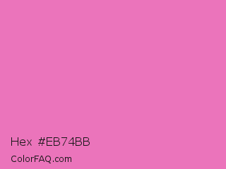 Hex #eb74bb Color is a light magenta color and the nearest color is Persian Pink #f77fbe. Hex code #eb74bb and RGB value is rgb(235,116,187). In RGB color space, this color is composed of 92% red, 45% green, 73% blue, In CMYK color space, this color is composed of 0% cyan, 51% magenta, 20% yellow , 8% black , In HSL color space, this color has a hue angle of 324° , 75% saturation and 69% lightness.