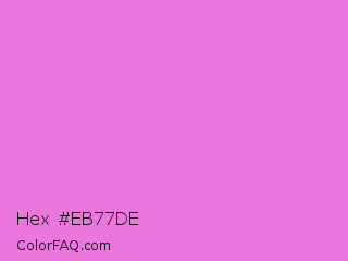 Hex #eb77de Color is a light magenta color and the nearest color is Lavender Magenta #ee82ee. Hex code #eb77de and RGB value is rgb(235,119,222). In RGB color space, this color is composed of 92% red, 47% green, 87% blue, In CMYK color space, this color is composed of 0% cyan, 49% magenta, 6% yellow , 8% black , In HSL color space, this color has a hue angle of 307° , 74% saturation and 69% lightness.