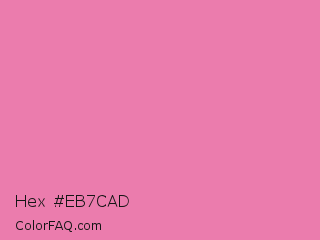 Hex #eb7cad Color is a light rose color and the nearest color is Carissma #ea88a8. Hex code #eb7cad and RGB value is rgb(235,124,173). In RGB color space, this color is composed of 92% red, 49% green, 68% blue, In CMYK color space, this color is composed of 0% cyan, 47% magenta, 26% yellow , 8% black , In HSL color space, this color has a hue angle of 334° , 74% saturation and 70% lightness.