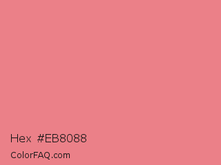 Hex #eb8088 Color is a light red color and the nearest color is Light Coral #f08080. Hex code #eb8088 and RGB value is rgb(235,128,136). In RGB color space, this color is composed of 92% red, 50% green, 53% blue, In CMYK color space, this color is composed of 0% cyan, 46% magenta, 42% yellow , 8% black , In HSL color space, this color has a hue angle of 356° , 73% saturation and 71% lightness.