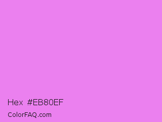 Hex #eb80ef Color is a light magenta color and the nearest color is Lavender Magenta #ee82ee. Hex code #eb80ef and RGB value is rgb(235,128,239). In RGB color space, this color is composed of 92% red, 50% green, 94% blue, In CMYK color space, this color is composed of 2% cyan, 46% magenta, 0% yellow , 6% black , In HSL color space, this color has a hue angle of 298° , 78% saturation and 72% lightness.