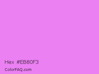 Hex #eb80f3 Color is a light magenta color and the nearest color is Lavender Magenta #ee82ee. Hex code #eb80f3 and RGB value is rgb(235,128,243). In RGB color space, this color is composed of 92% red, 50% green, 95% blue, In CMYK color space, this color is composed of 3% cyan, 47% magenta, 0% yellow , 5% black , In HSL color space, this color has a hue angle of 296° , 83% saturation and 73% lightness.