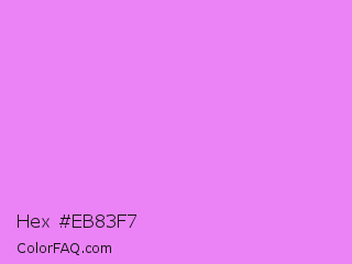 Hex #eb83f7 Color is a light magenta color and the nearest color is Lavender Magenta #ee82ee. Hex code #eb83f7 and RGB value is rgb(235,131,247). In RGB color space, this color is composed of 92% red, 51% green, 97% blue, In CMYK color space, this color is composed of 5% cyan, 47% magenta, 0% yellow , 3% black , In HSL color space, this color has a hue angle of 294° , 88% saturation and 74% lightness.