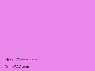 Hex #eb86eb Color is a light magenta color and the nearest color is Lavender Magenta #ee82ee. Hex code #eb86eb and RGB value is rgb(235,134,235). In RGB color space, this color is composed of 92% red, 53% green, 92% blue, In CMYK color space, this color is composed of 0% cyan, 43% magenta, 0% yellow , 8% black , In HSL color space, this color has a hue angle of 300° , 72% saturation and 72% lightness.