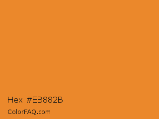 Hex #eb882b Color is a normal orange color and the nearest color is Cadmium Orange #ed872d. Hex code #eb882b and RGB value is rgb(235,136,43). In RGB color space, this color is composed of 92% red, 53% green, 17% blue, In CMYK color space, this color is composed of 0% cyan, 42% magenta, 82% yellow , 8% black , In HSL color space, this color has a hue angle of 29° , 83% saturation and 55% lightness.