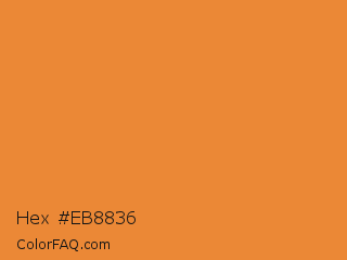 Hex #eb8836 Color is a normal orange color and the nearest color is Cadmium Orange #ed872d. Hex code #eb8836 and RGB value is rgb(235,136,54). In RGB color space, this color is composed of 92% red, 53% green, 21% blue, In CMYK color space, this color is composed of 0% cyan, 42% magenta, 77% yellow , 8% black , In HSL color space, this color has a hue angle of 27° , 82% saturation and 57% lightness.