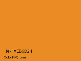 Hex #eb8b24 Color is a normal orange color and the nearest color is Carrot Orange #ed9121. Hex code #eb8b24 and RGB value is rgb(235,139,36). In RGB color space, this color is composed of 92% red, 55% green, 14% blue, In CMYK color space, this color is composed of 0% cyan, 41% magenta, 85% yellow , 8% black , In HSL color space, this color has a hue angle of 31° , 83% saturation and 53% lightness.