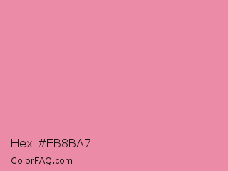 Hex #eb8ba7 Color is a light rose color and the nearest color is Carissma #ea88a8. Hex code #eb8ba7 and RGB value is rgb(235,139,167). In RGB color space, this color is composed of 92% red, 55% green, 65% blue, In CMYK color space, this color is composed of 0% cyan, 41% magenta, 29% yellow , 8% black , In HSL color space, this color has a hue angle of 343° , 71% saturation and 73% lightness.