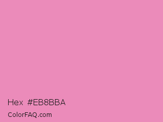 Hex #eb8bba Color is a light rose color and the nearest color is Shocking #e292c0. Hex code #eb8bba and RGB value is rgb(235,139,186). In RGB color space, this color is composed of 92% red, 55% green, 73% blue, In CMYK color space, this color is composed of 0% cyan, 41% magenta, 21% yellow , 8% black , In HSL color space, this color has a hue angle of 331° , 71% saturation and 73% lightness.