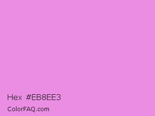Hex #eb8ee3 Color is a light magenta color and the nearest color is Lavender Magenta #ee82ee. Hex code #eb8ee3 and RGB value is rgb(235,142,227). In RGB color space, this color is composed of 92% red, 56% green, 89% blue, In CMYK color space, this color is composed of 0% cyan, 40% magenta, 3% yellow , 8% black , In HSL color space, this color has a hue angle of 305° , 70% saturation and 74% lightness.