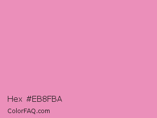 Hex #eb8fba Color is a light rose color and the nearest color is Shocking #e292c0. Hex code #eb8fba and RGB value is rgb(235,143,186). In RGB color space, this color is composed of 92% red, 56% green, 73% blue, In CMYK color space, this color is composed of 0% cyan, 39% magenta, 21% yellow , 8% black , In HSL color space, this color has a hue angle of 332° , 70% saturation and 74% lightness.