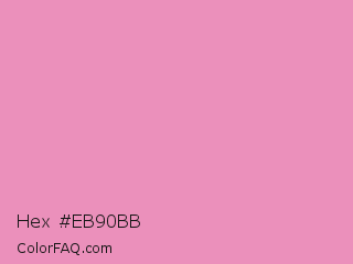 Hex #eb90bb Color is a light rose color and the nearest color is Shocking #e292c0. Hex code #eb90bb and RGB value is rgb(235,144,187). In RGB color space, this color is composed of 92% red, 56% green, 73% blue, In CMYK color space, this color is composed of 0% cyan, 39% magenta, 20% yellow , 8% black , In HSL color space, this color has a hue angle of 332° , 69% saturation and 74% lightness.