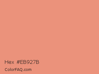 Hex #eb927b Color is a light red color and the nearest color is Dark Salmon #e9967a. Hex code #eb927b and RGB value is rgb(235,146,123). In RGB color space, this color is composed of 92% red, 57% green, 48% blue, In CMYK color space, this color is composed of 0% cyan, 38% magenta, 48% yellow , 8% black , In HSL color space, this color has a hue angle of 12° , 74% saturation and 70% lightness.