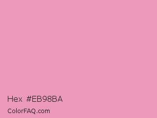 Hex #eb98ba Color is a light rose color and the nearest color is Amaranth Pink #f19cbb. Hex code #eb98ba and RGB value is rgb(235,152,186). In RGB color space, this color is composed of 92% red, 60% green, 73% blue, In CMYK color space, this color is composed of 0% cyan, 35% magenta, 21% yellow , 8% black , In HSL color space, this color has a hue angle of 335° , 67% saturation and 76% lightness.