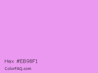 Hex #eb98f1 Color is a light magenta color and the nearest color is Bright Lilac #d891ef. Hex code #eb98f1 and RGB value is rgb(235,152,241). In RGB color space, this color is composed of 92% red, 60% green, 95% blue, In CMYK color space, this color is composed of 2% cyan, 37% magenta, 0% yellow , 5% black , In HSL color space, this color has a hue angle of 296° , 76% saturation and 77% lightness.