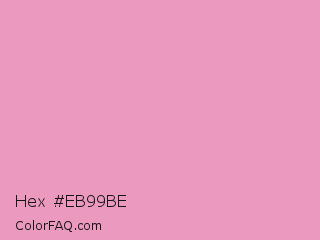 Hex #eb99be Color is a light rose color and the nearest color is Amaranth Pink #f19cbb. Hex code #eb99be and RGB value is rgb(235,153,190). In RGB color space, this color is composed of 92% red, 60% green, 75% blue, In CMYK color space, this color is composed of 0% cyan, 35% magenta, 19% yellow , 8% black , In HSL color space, this color has a hue angle of 333° , 67% saturation and 76% lightness.