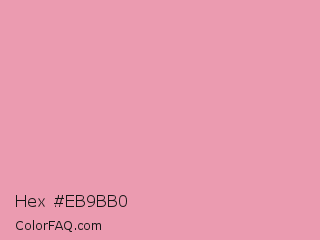 Hex #eb9bb0 Color is a light rose color and the nearest color is Mauvelous #ef98aa. Hex code #eb9bb0 and RGB value is rgb(235,155,176). In RGB color space, this color is composed of 92% red, 61% green, 69% blue, In CMYK color space, this color is composed of 0% cyan, 34% magenta, 25% yellow , 8% black , In HSL color space, this color has a hue angle of 344° , 67% saturation and 76% lightness.