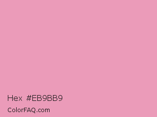 Hex #eb9bb9 Color is a light rose color and the nearest color is Amaranth Pink #f19cbb. Hex code #eb9bb9 and RGB value is rgb(235,155,185). In RGB color space, this color is composed of 92% red, 61% green, 73% blue, In CMYK color space, this color is composed of 0% cyan, 34% magenta, 21% yellow , 8% black , In HSL color space, this color has a hue angle of 338° , 67% saturation and 76% lightness.