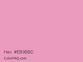 Hex #eb9bbd Color is a light rose color and the nearest color is Amaranth Pink #f19cbb. Hex code #eb9bbd and RGB value is rgb(235,155,189). In RGB color space, this color is composed of 92% red, 61% green, 74% blue, In CMYK color space, this color is composed of 0% cyan, 34% magenta, 20% yellow , 8% black , In HSL color space, this color has a hue angle of 335° , 67% saturation and 76% lightness.